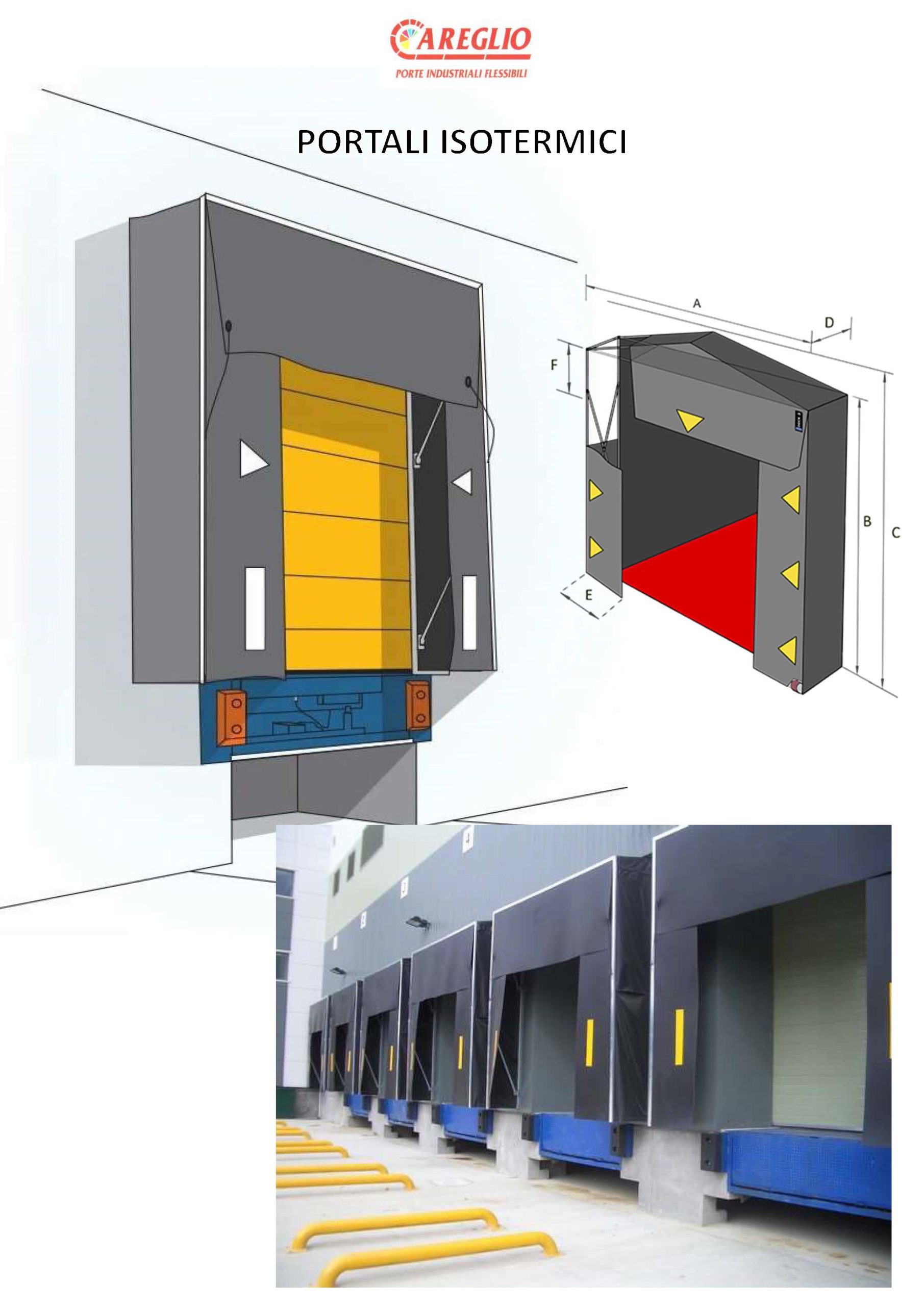 I portali isotermici Careglio, realizzati in acciaio zincato e con telo in PVC, sono progettati per ridurre al minimo gli scambi termici tra magazzino e automezzo refrigerato, limitando così gli sprechi energetici e mantenendo inalterata la qualità dei prodotti.